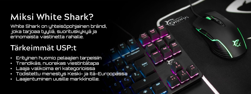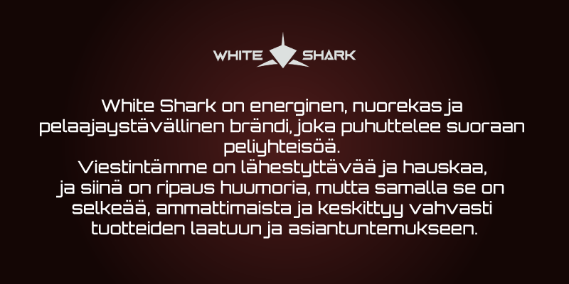 White Shark symboloi puhdasta rakkautta pelaamiseen ja hauskanpitoon. Mutta kehittyessämme alamme arvostaa paitsi sitä, mikä on hyväksi meille, myös koko ympäröivää maailmaa. Se sai meidät miettimään teknologiaa ja kaikkia sen tuomia ihmeitä, myös pelaamisen uskomatonta maailmaa. White Shark on kehittymässä symboliksi siitä, että välitämme ympäröivästä maailmasta, unohtamatta kuitenkaan hauskanpitoa. Sen vuoksi loimme ”We Care” -kampanjan.