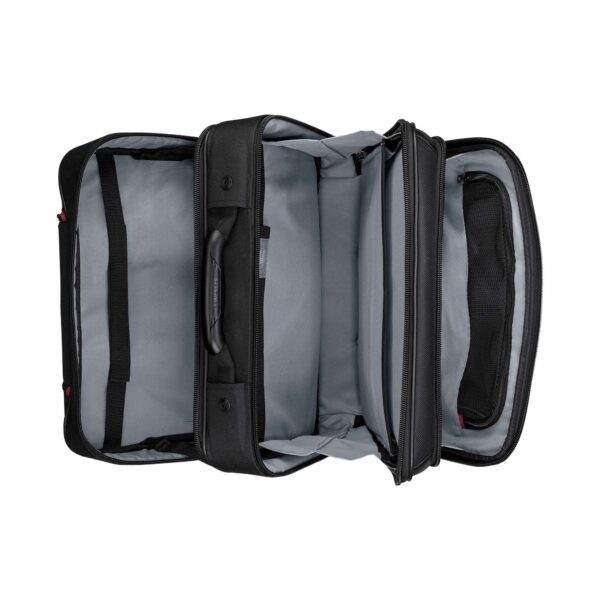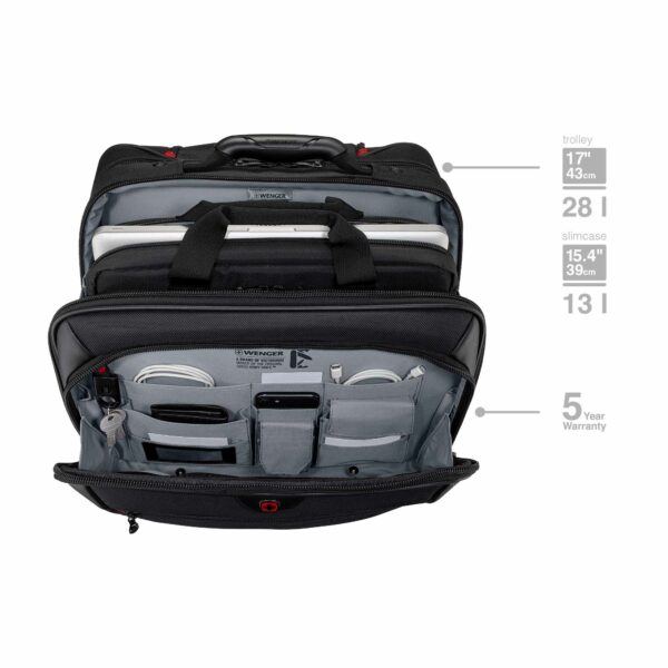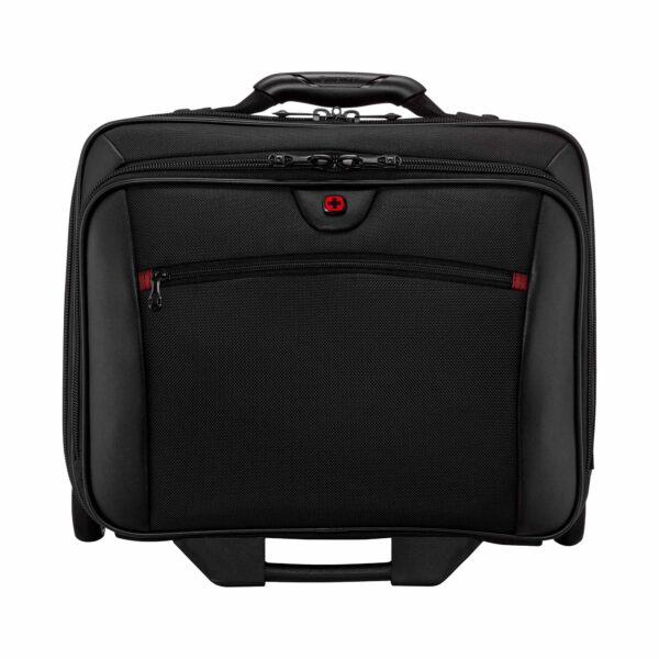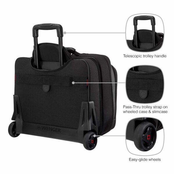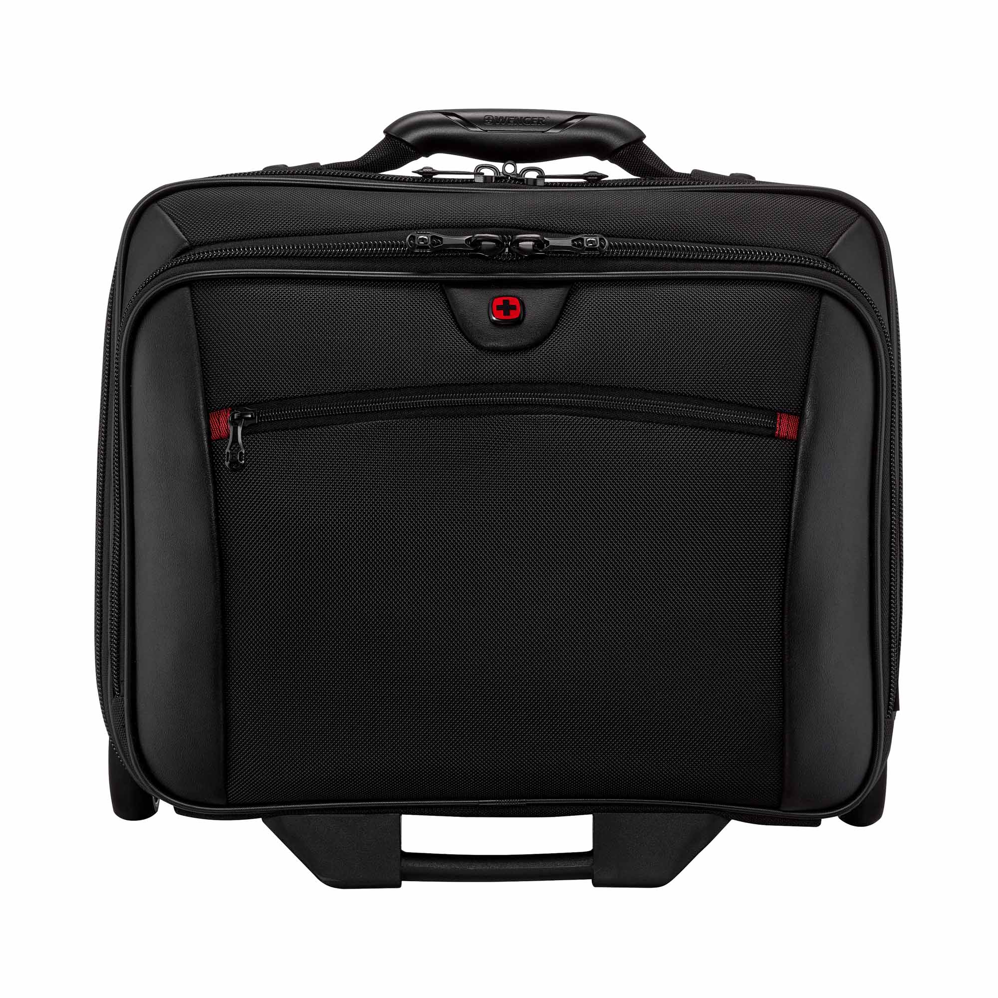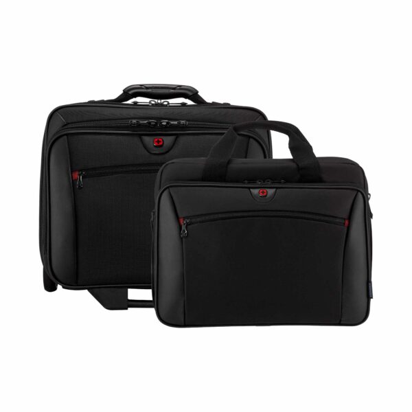 Tässä on Potomac, kaksiosainen matkasetti, jossa on Comp-U-Roller, jossa on suojaava kannettavan tietokoneen lokero, sekä siihen sopiva irrotettava ohut kannettavan tietokoneen kotelo kevyitä matkatavaroita varten. Tilava päälokero mahtuu helposti yhden yön vaatteet, ja tarvikkeiden säilytyslokero pitää päivittäiset tavarat järjestyksessä. Asiakirjat pysyvät ehjinä ulosvedettävän tiedostojen jakajan ansiosta, ja lukittava vetoketju tarjoaa lisäsuojaa. Kevyesti rullattavat pyörät helpottavat liikkumista.