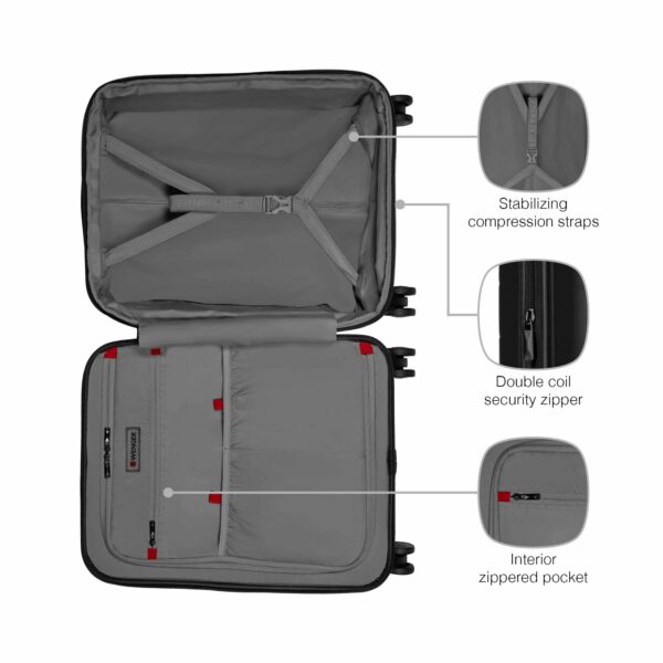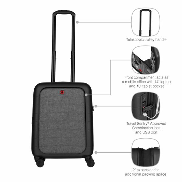 Syntry Carry-On on kestävä mutta silti täydellisen kannettava matkalaukku, jossa on pyörät ja joka on erittäin helppo käsitellä. Muovattu etutasku suojaa kannettavaa tietokonetta ja tablettia, ja pikatasku tarjoaa nopean pääsyn tärkeisiin esineisiin. Se on tilava ja turvallinen yhdistelmälukon ja turvaketjun ansiosta, ja siinä on myös USB-laturi ja integroitu ID-tasku.