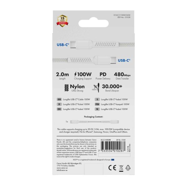 Kaapelit ovat USB 2.0 -standardin mukaisia ja saatavilla USB-A -> USB-C (60 W) ja USB-C -> USB-C (100 W) -malleina neljänä eri pituutena: 0,5 m, 1 m, 2 m ja 3 m.