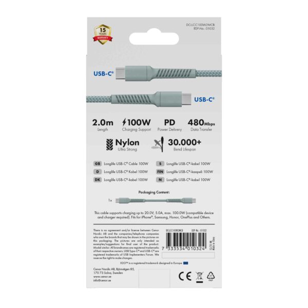 Kaapelit ovat USB 2.0 -standardin mukaisia ja saatavilla USB-A -> USB-C (60 W) ja USB-C -> USB-C (100 W) -malleina neljänä eri pituutena: 0,5 m, 1 m, 2 m ja 3 m.