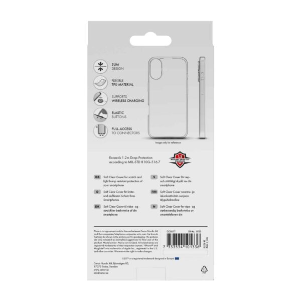 Täysin kirkas, ohut ja erittäin joustava kotelo, joka suojaa kevyiltä iskuilta ja naarmuilta. Pudotustestattu 1,2 metrin korkeudesta MIL-STD810G-516.7 -standardin mukaisesti.