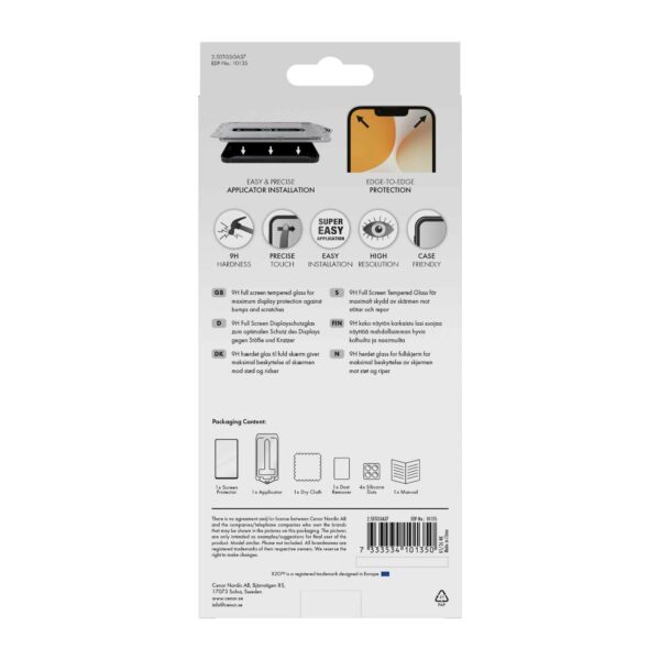 Näytönsuoja on valmistettu 0,33 mm:n paksuisesta vahvistetusta 9H-lasista ja se peittää koko näytön, myös pyöristetyt reunat. Mukana toimitettava asennuskehys takaa nopean ja tarkan asennuksen ilman pölyä ja kuplia.
