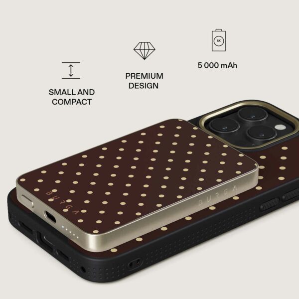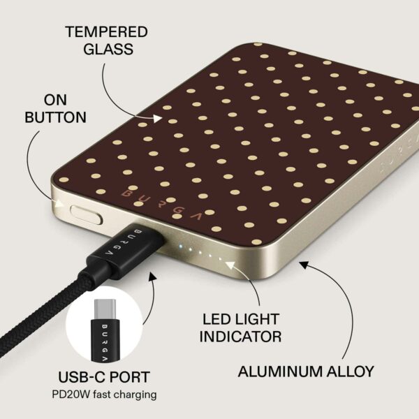 Täydellinen yhdistelmä muotia ja toimivuutta. Tämä tyylikäs 5000 mAh:n tehopakkaus pitää laitteesi ladattuna ja lisää tyylikkyyttä BURGAn ainutlaatuisella, haalistumattomalla muotoilulla. Se on enemmän kuin pelkkä virtapankki; se on statement-osa, joka antaa virtaa laitteillesi missä ja milloin tahansa.