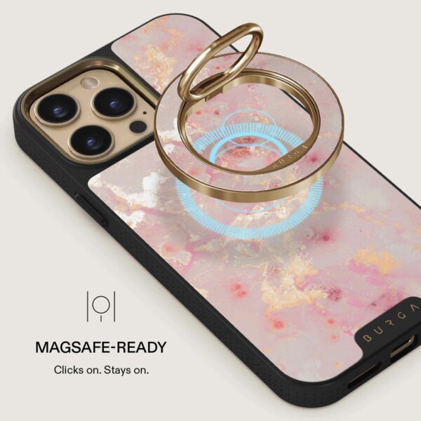 Huom! Tämä matkapuhelimen pidike toimii vain MagSafe-yhteensopivien iPhone-mallien (12 ja uudemmat) ja BURGA:n MagSafe-kuorien kanssa. Se ei toimi kuorien kanssa, joissa ei ole MagSafe-ominaisuutta tai langatonta latausta.