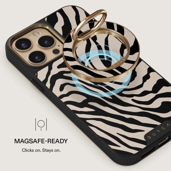 Huom! Tämä matkapuhelimen pidike toimii vain MagSafe-yhteensopivien iPhone-mallien (12 ja uudemmat) ja BURGA:n MagSafe-kuorien kanssa. Se ei toimi kuorien kanssa, joissa ei ole MagSafe-ominaisuutta tai langatonta latausta.