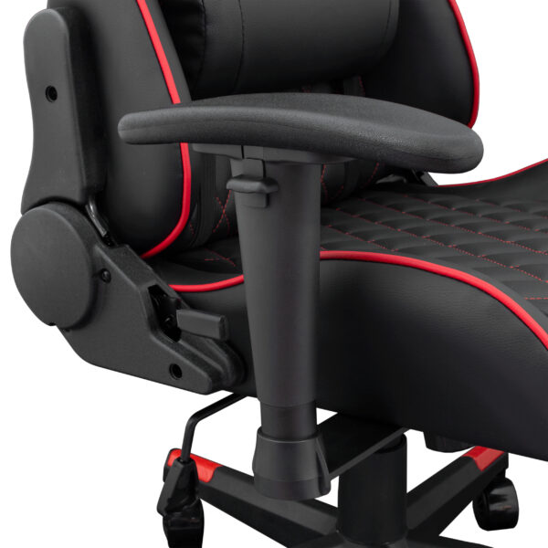 2D-käsinojat, 180° kallistus ja pää-/selkätyynyt takaavat äärimmäisen mukavuuden. Tyylikäs musta ja punainen PU-päällinen tuo tyylikkyyttä, kun taas tukeva metallirunko takaa kestävyyden.