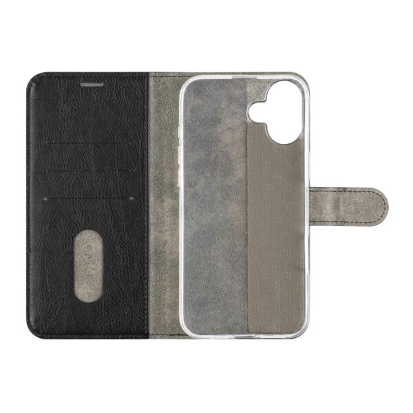 Kun avaat etuosan, löydät suuremman lokeron seteleille ja kolme pienempää lokeroa luottokorttien säilyttämiseen. Magneettilukko varmistaa, että kotelo sulkeutuu turvallisesti. Avoin kotelo voidaan säätää vaakasuoraan telineasentoon mukavaa videon katselua varten.