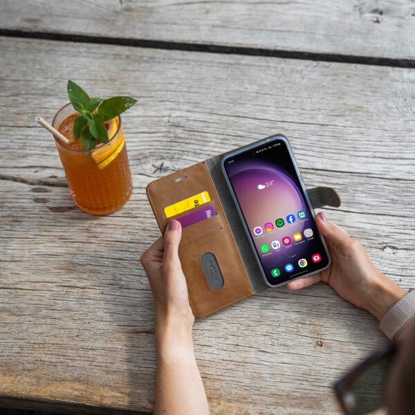Opus-kotelo on valmistettu kestävästä synteettisestä nahasta, joka kestää kovaakin käsittelyä ja säilyttää samalla tyylikkään ulkonäkönsä. Kapean muotoilunsa ansiosta kotelo lisää puhelimen mittoja vain minimaalisesti ja mahtuu siksi mukavasti taskuun tai käsilaukkuun.