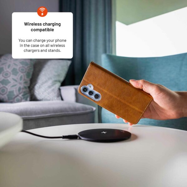 Opus-kotelo on valmistettu kestävästä synteettisestä nahasta, joka kestää kovaakin käsittelyä ja säilyttää samalla tyylikkään ulkonäkönsä. Kapean muotoilunsa ansiosta kotelo lisää puhelimen mittoja vain minimaalisesti ja mahtuu siksi mukavasti taskuun tai käsilaukkuun.