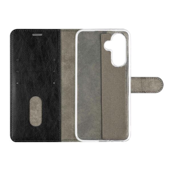 Kun avaat etuosan, löydät suuremman lokeron seteleille ja kolme pienempää lokeroa luottokorttien säilyttämiseen. Magneettilukko varmistaa, että kotelo sulkeutuu turvallisesti. Avoin kotelo voidaan säätää vaakasuoraan telineasentoon mukavaa videon katselua varten.