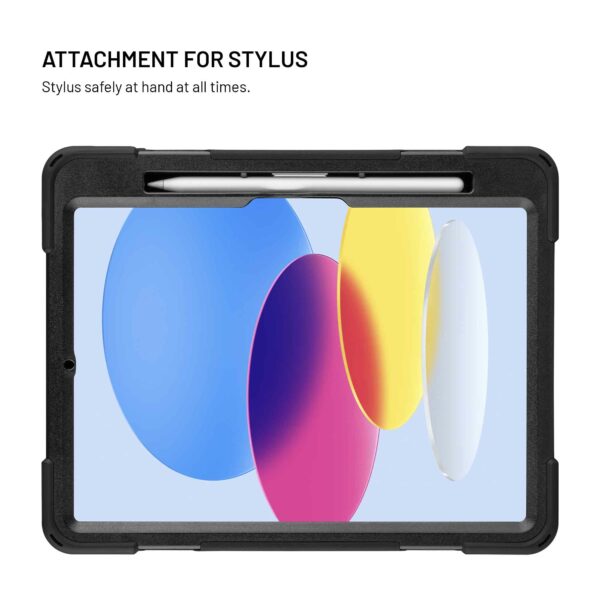 Kotelon takana on käännettävä kahva, joka helpottaa tabletin pitämistä ja käsittelyä. Kahvaa voidaan kääntää 360°, joten voit helposti säätää sen haluamaasi asentoon ja käyttää tarranauhaa säätääksesi kahvan hihnan haluamaasi käden kokoon. Kahva toimii myös kätevänä telineenä – käännä se vain ulos, niin tablet-tietokone asettuu vakaasti vaakasuoraan asentoon, mikä on täydellinen videoiden katseluun, videopuheluiden soittamiseen tai työskentelyyn matkoilla.