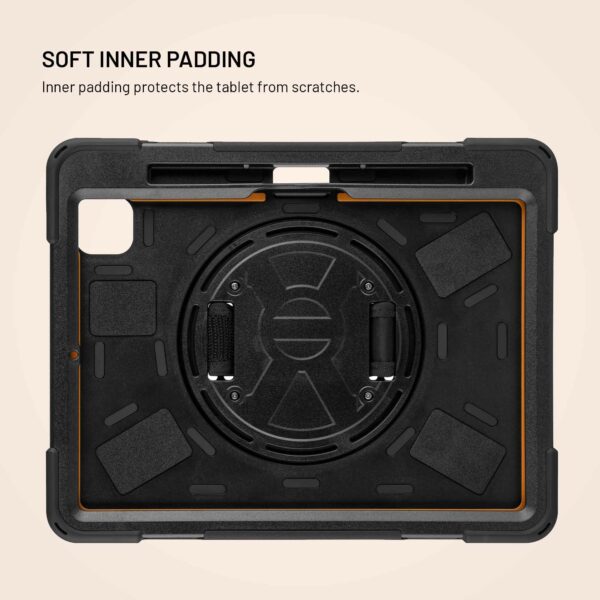 Vahvistettu rakenne kulmissa ja sivuilla vaimentaa iskuja luotettavasti. Samalla korotetut reunat suojaavat näyttöä vaurioilta, kun laite asetetaan näytön alaspäin. Sisäinen silikonipehmuste tarjoaa lisävaimennusta ja suojaa tabletille.