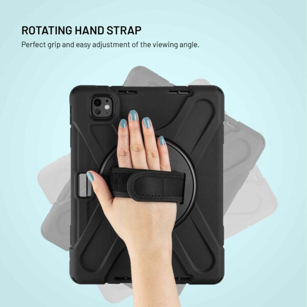 Kotelon takana on käännettävä kahva, joka helpottaa tabletin pitämistä ja käsittelyä. Kahvaa voidaan kääntää 360°, joten voit helposti säätää sen haluamaasi asentoon ja käyttää tarranauhaa säätääksesi kahvan hihnan haluamaasi käden kokoon. Kahva toimii myös kätevänä telineenä – käännä se vain ulos, niin tablet-tietokone asettuu vakaasti vaakasuoraan asentoon, mikä on täydellinen videoiden katseluun, videopuheluiden soittamiseen tai työskentelyyn matkoilla.