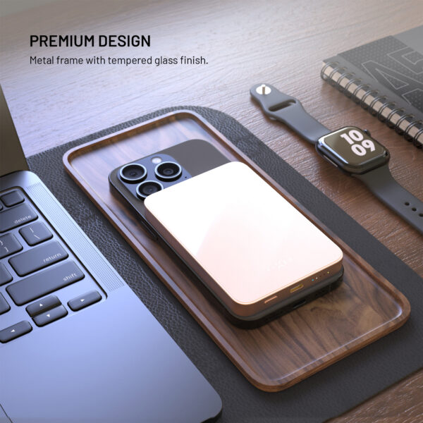 5 000 mAh:n kapasiteetti riittää yhdelle tai kahdelle puhelimen lataukselle, ja neljä LED-merkkivaloa osoittavat akun tilan selvästi. Kotelo yhdistää metallikehyksen ja karkaistun lasin, jonka latauspinta on mattapintainen, mikä suojaa puhelinta naarmuilta. Ohuen, vain 9,4 mm:n muotoilunsa ansiosta se sulautuu puhelimeen ja mahtuu mukavasti taskuun.