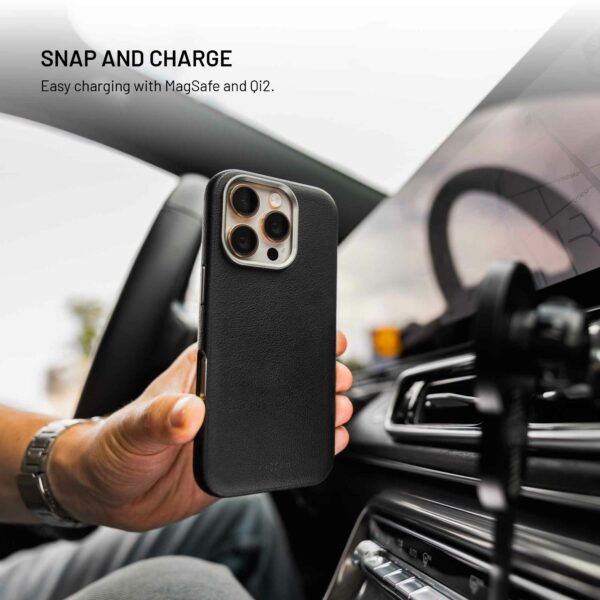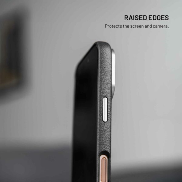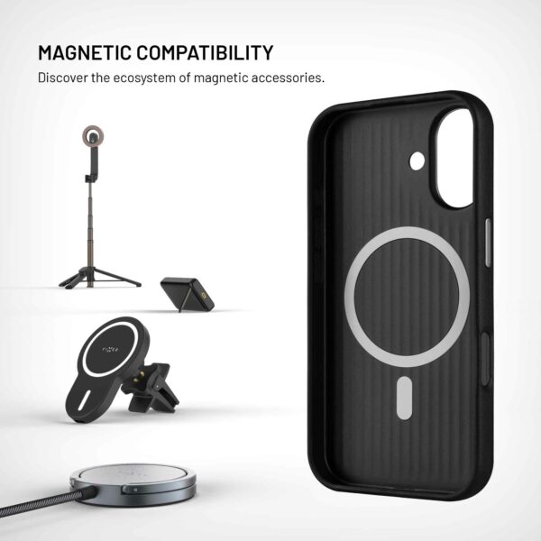 Suojus on varustettu integroiduilla magneeteilla, jotka kiinnittyvät tarkasti ja turvallisesti MagSafe-laturiin, pidikkeeseen ja muihin MagSafe-lisävarusteisiin. Ohuen rakenteensa ja vahvistettujen kulmiensa ansiosta kotelo suojaa puhelinta luotettavasti tavallisilta iskuilta ja pudotuksilta ilman, että se lisää puhelimen kokoa. Kotelon muotoilua täydentävät myös metalliset yksityiskohdat, kuten kameran ympärillä oleva kehys ja painikkeiden suojukset.