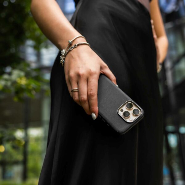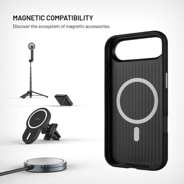 Suojus on varustettu integroiduilla magneeteilla, jotka kiinnittyvät tarkasti ja turvallisesti MagSafe-laturiin, pidikkeeseen ja muihin MagSafe-lisävarusteisiin. Ohuen rakenteensa ja vahvistettujen kulmiensa ansiosta kotelo suojaa puhelinta luotettavasti tavallisilta iskuilta ja pudotuksilta ilman, että se lisää puhelimen kokoa. Kotelon muotoilua täydentävät myös metalliset yksityiskohdat, kuten kameran ympärillä oleva kehys ja painikkeiden suojukset.
