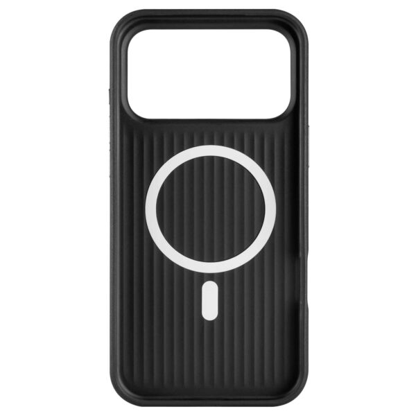 Suojus on varustettu integroiduilla magneeteilla, jotka kiinnittyvät tarkasti ja turvallisesti MagSafe-laturiin, pidikkeeseen ja muihin MagSafe-lisävarusteisiin. Ohuen rakenteensa ja vahvistettujen kulmiensa ansiosta kotelo suojaa puhelinta luotettavasti tavallisilta iskuilta ja pudotuksilta ilman, että se lisää puhelimen kokoa. Kotelon muotoilua täydentävät myös metalliset yksityiskohdat, kuten kameran ympärillä oleva kehys ja painikkeiden suojukset.