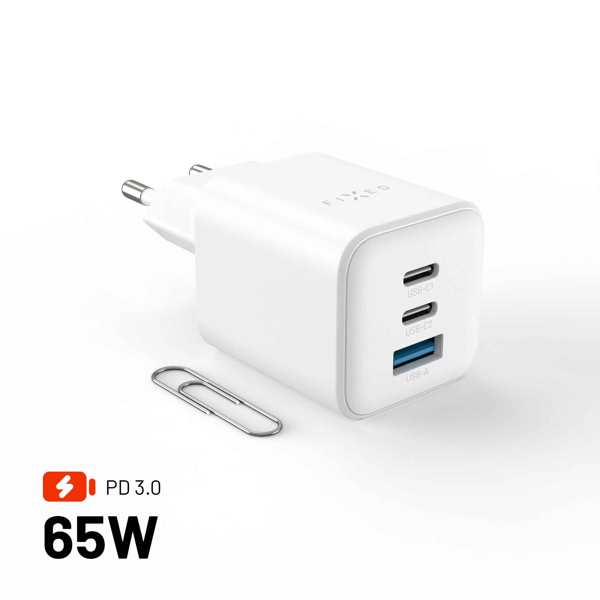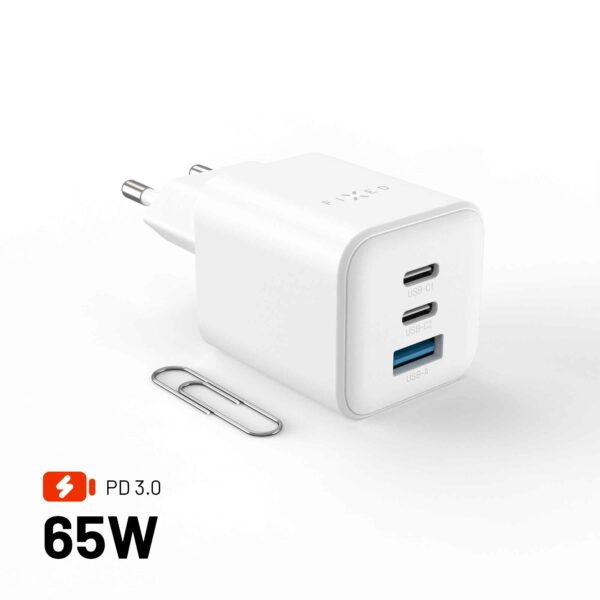 FIXED-minilaturin, jonka teho on 65 W ja joka tukee Power Delivery 3.0:aa USB-C-portin kautta, lataa nopeasti ja luotettavasti kaikki laitteesi – matkapuhelimesta MacBookiin.