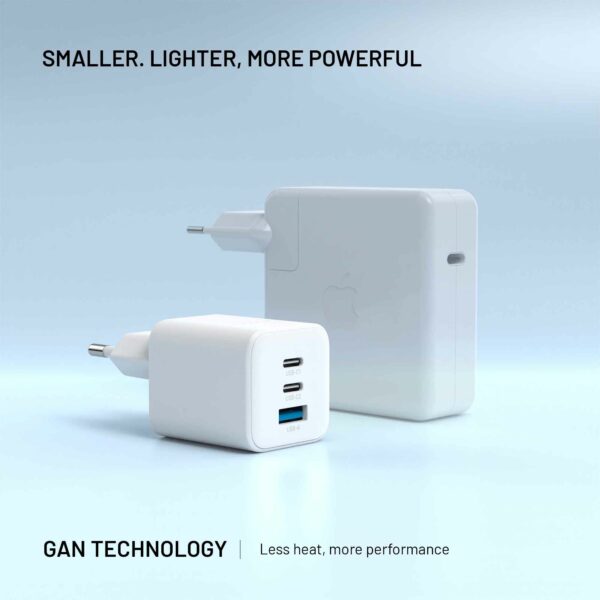 Adapteri on varustettu ainutlaatuisella GaN-tekniikalla, jonka ansiosta laturin kokoa on voitu pienentää ja samalla säilyttää turvallisesti ja tehokkaasti korkea suorituskyky ja nopea lataus ilman ylikuumenemista.