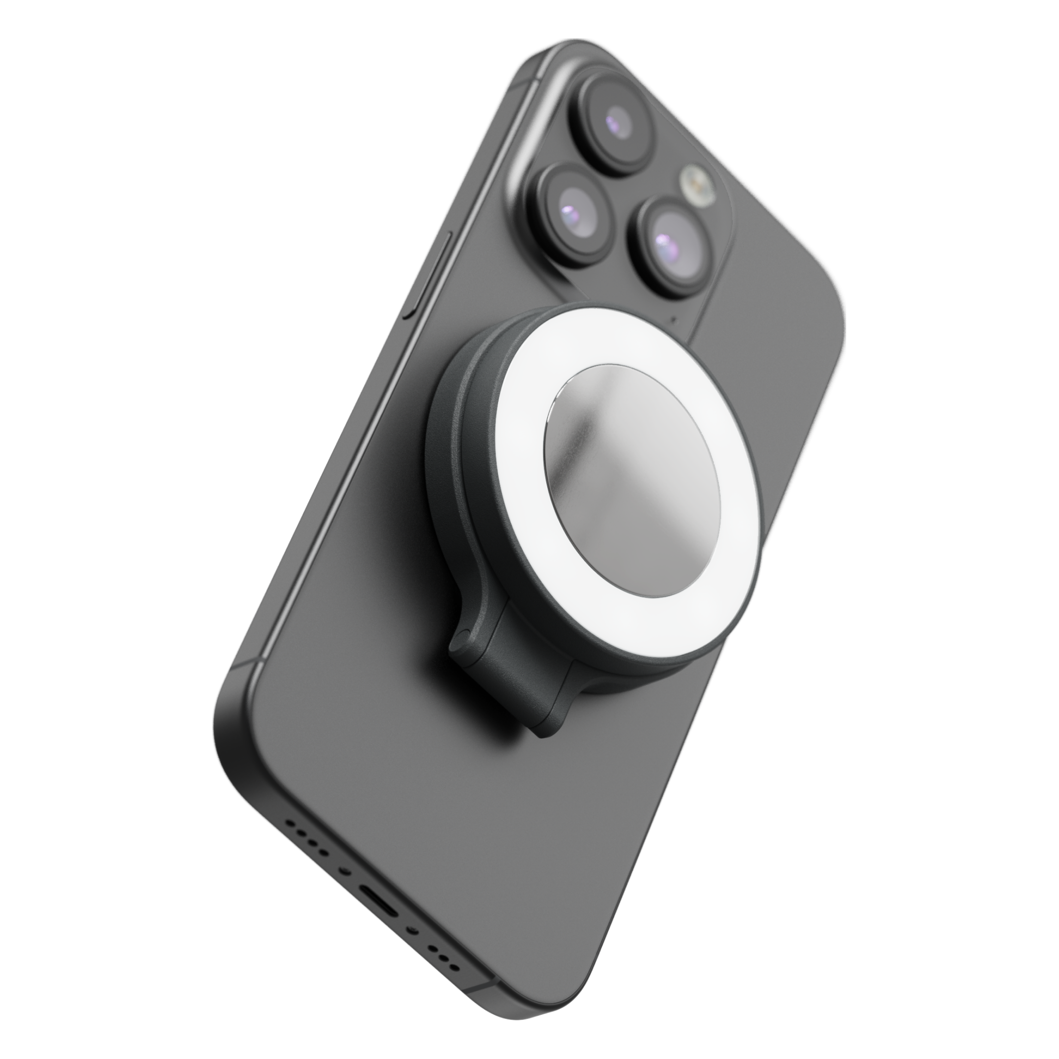 Sisäänrakennettu peili ja käännettävä magneettikiinnike – napsauta, käännä ja säädä valaistusta selfietä tai taustakuvaa varten helposti.