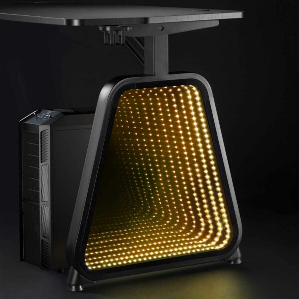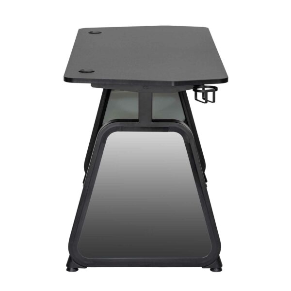 Valmistaudu eeppisiin taisteluihin. Valmistettu lastulevystä, teräksestä ja karkaistusta lasista, se on yhtä kestävä kuin tyylikäs mustana. Sisäänrakennettu ”infinity” RGB LED -valaistus toimii USB 5V/2A:lla ja luo tunnelmaa. Se tarjoaa tilaa myös kuulokkeillesi ja pitää juomasi käden ulottuvilla. 75 kg:n kantavuudella ja mitoiltaan 1360x600x750 mm voit valloittaa pelimaailman tyylikkäästi.