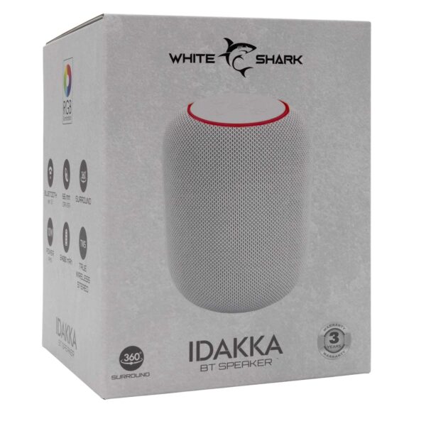 Koe ympäröivä ääni White Shark IDAKKA Bluetooth-kaiuttimella. Laajan taajuusalueen ja tehokkaan 2x5W RMS-lähtötehon ansiosta voit nauttia rikkaasta äänestä. Tyylikäs muotoilu, valaistuksella varustettuna, tuo tyylikkyyttä kaikkiin ympäristöihin. Kannettava, 2400 mAh:n akulla, jopa 4 tuntia musiikin toistoa.
